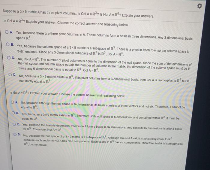Solved o Suppose a 3x9 matrix A has three pivot columns. Is | Chegg.com