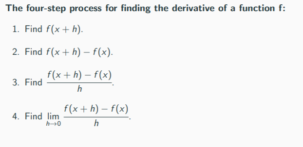 Find the derivative of a function using the "four step process", i.e ...