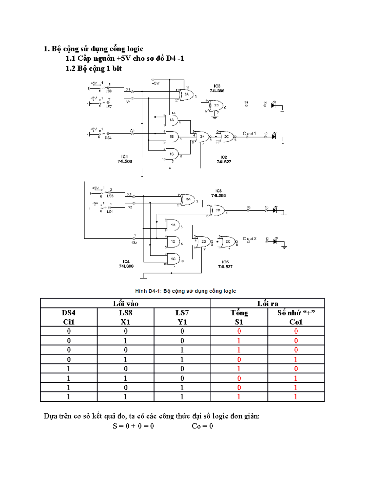 BÁO CÁO THỰC HÀNH ĐTS TUẦN 4 - Bộ cộng sử dụng cổng logic 1 Cấp nguồn ...