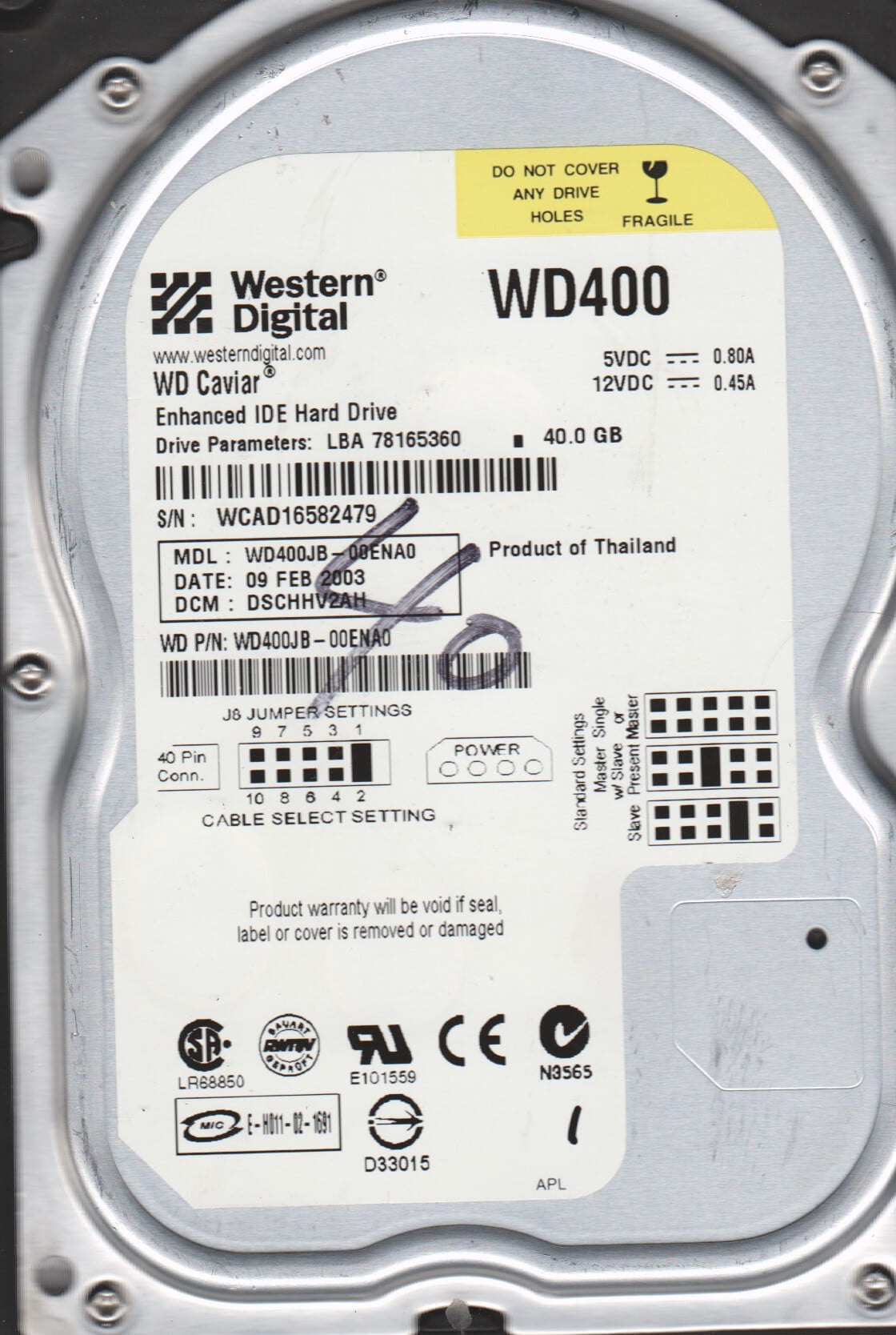 40GB IDE HDD, WD CAVIAR WD400BB-60DGA0, 11JUL2003 DCM: DSBANV2CH, P/N ...