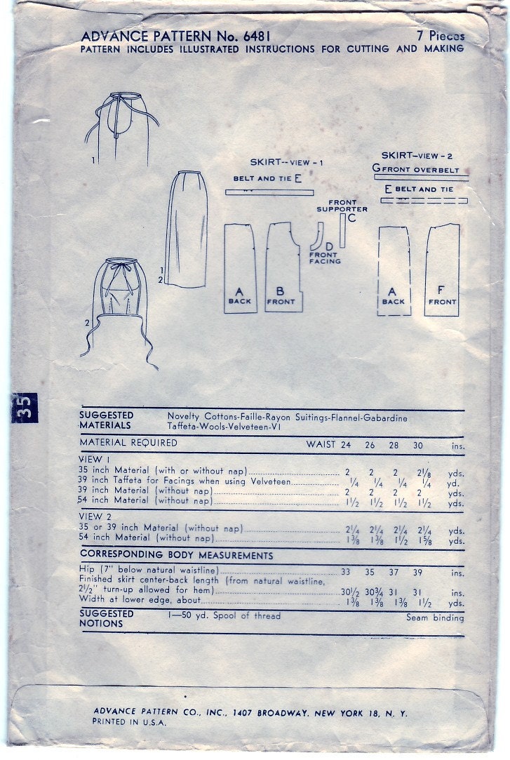 Vintage 1952 Advance 6481 Sewing Pattern Maternity Skirt Size | Etsy