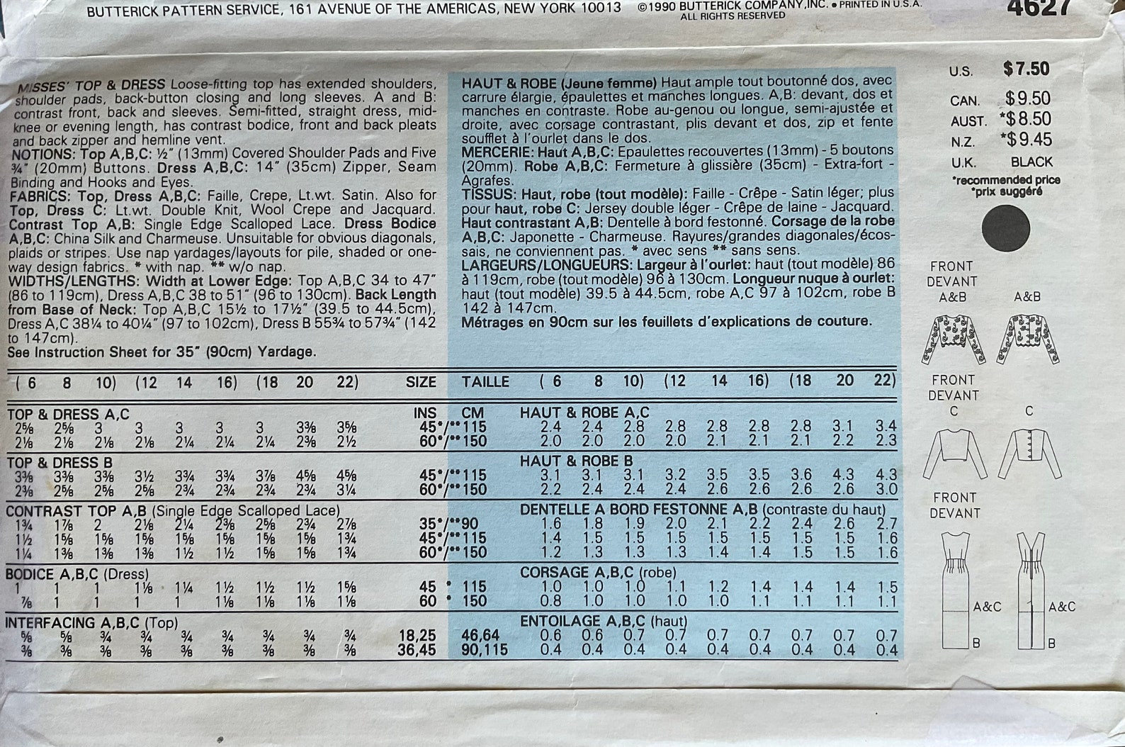 Uncut Butterick Sewing Pattern #4627 for Misses' Top and Dress With ...