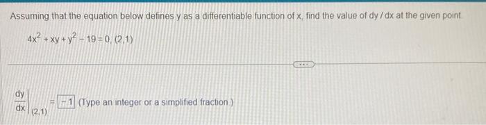 Solved 4x2+xy+y2−19=0,(2,1) dxdy∣∣(2,1)= (Type an integer or | Chegg.com