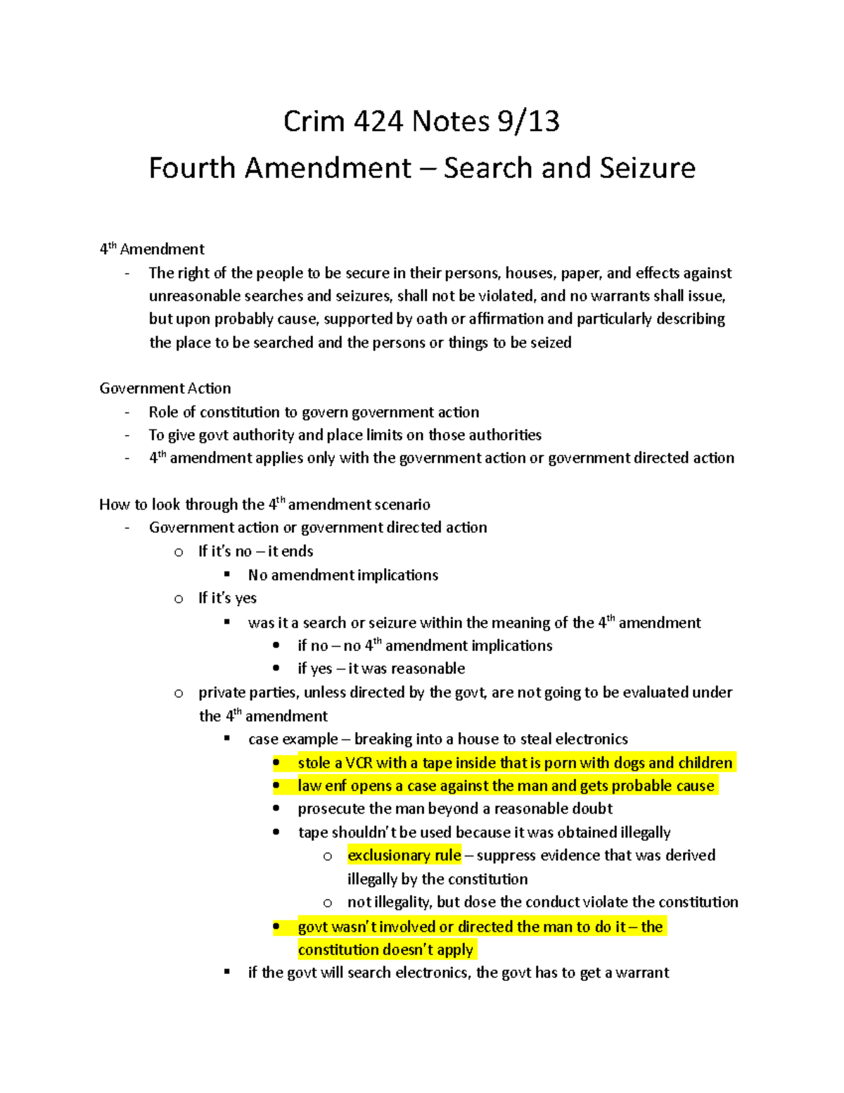 Crim 424 Notes 9:13 - Lisa Baker - Crim 424 Notes Fourth Amendment ...