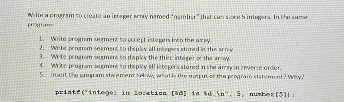 Solved 1. Define and create an array of 5 integers. The | Chegg.com