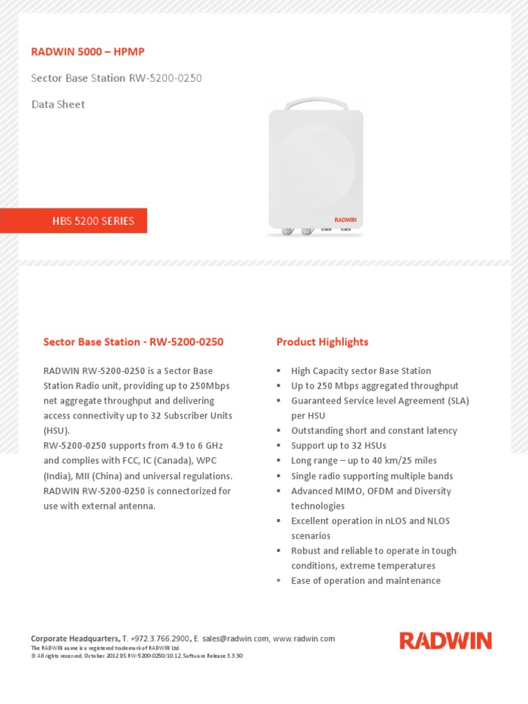 Sector Base Station RW-5200-0250 Data Sheet: Radwin 5000 - HPMP | PDF ...