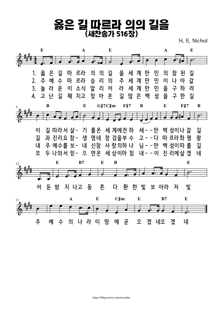 [악보] 새찬송가 516장 - 옳은 길 따르라 의의 길을 (Eb코드, E코드) : 네이버 블로그