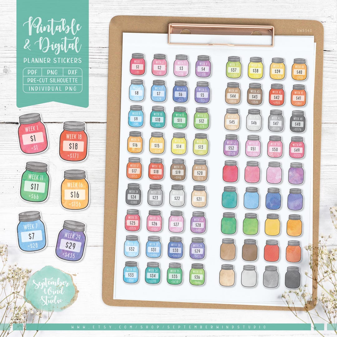 52 Week Savings Challenge Planner Stickers Savings Stickers Mason Jar ...