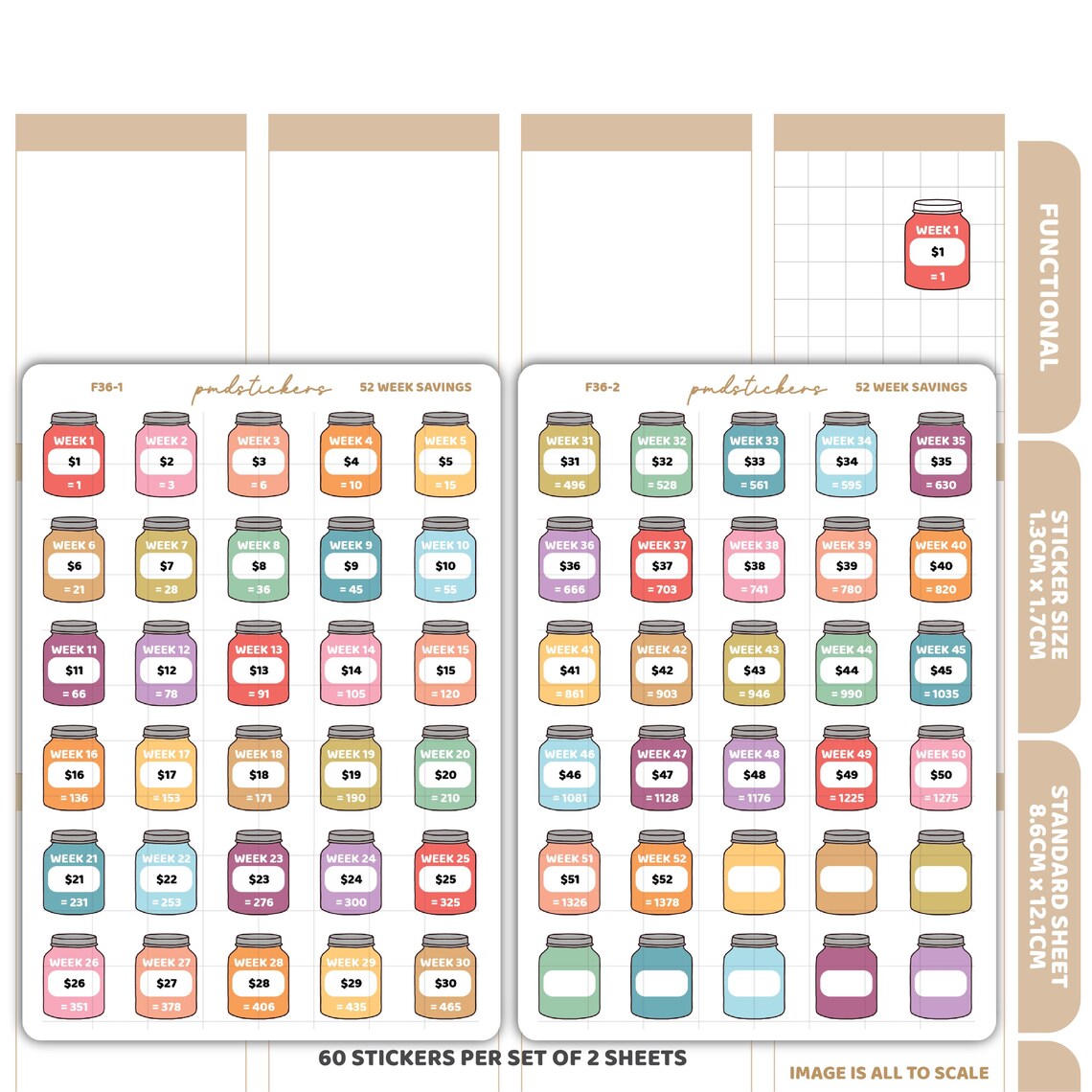 52 Week Savings Challenge Stickers | Functional Planner Stickers | F36 ...