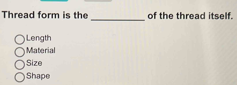 Solved: Thread form is the _of the thread itself. Length Material Size ...