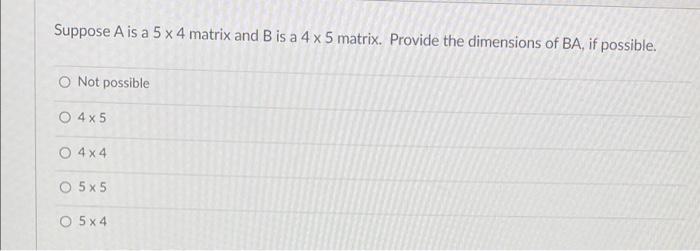 [Solved] If A is a 5x4 matrix, and B is a 4x5 matrix, then AB is a 4x5 ...