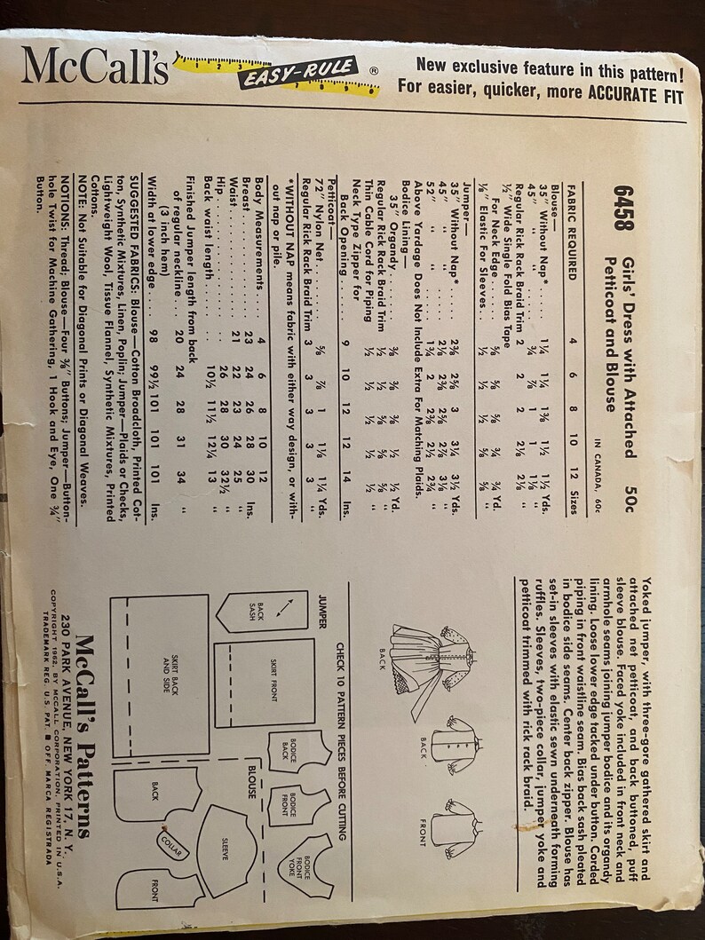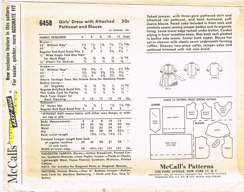Mccall's 6458 Vintage Sewing Pattern Girls Jumper With Petticoat and ...