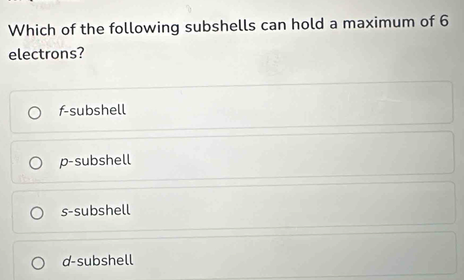 Solved: Which of the following subshells can hold a maximum of 6 ...
