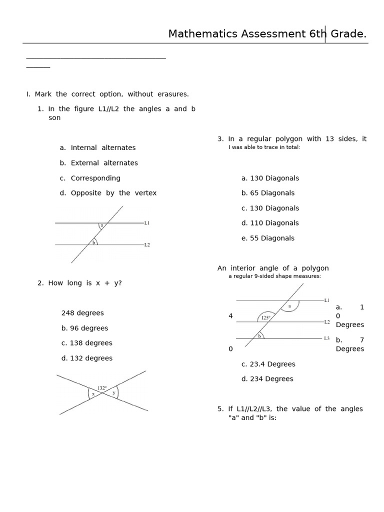 Test 6th Lines and Parallel Lines | PDF | Angle | Polygon
