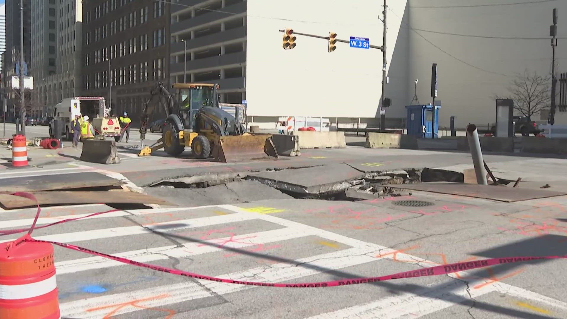 Busy intersection shut down after large sinkhole opens in downtown ...