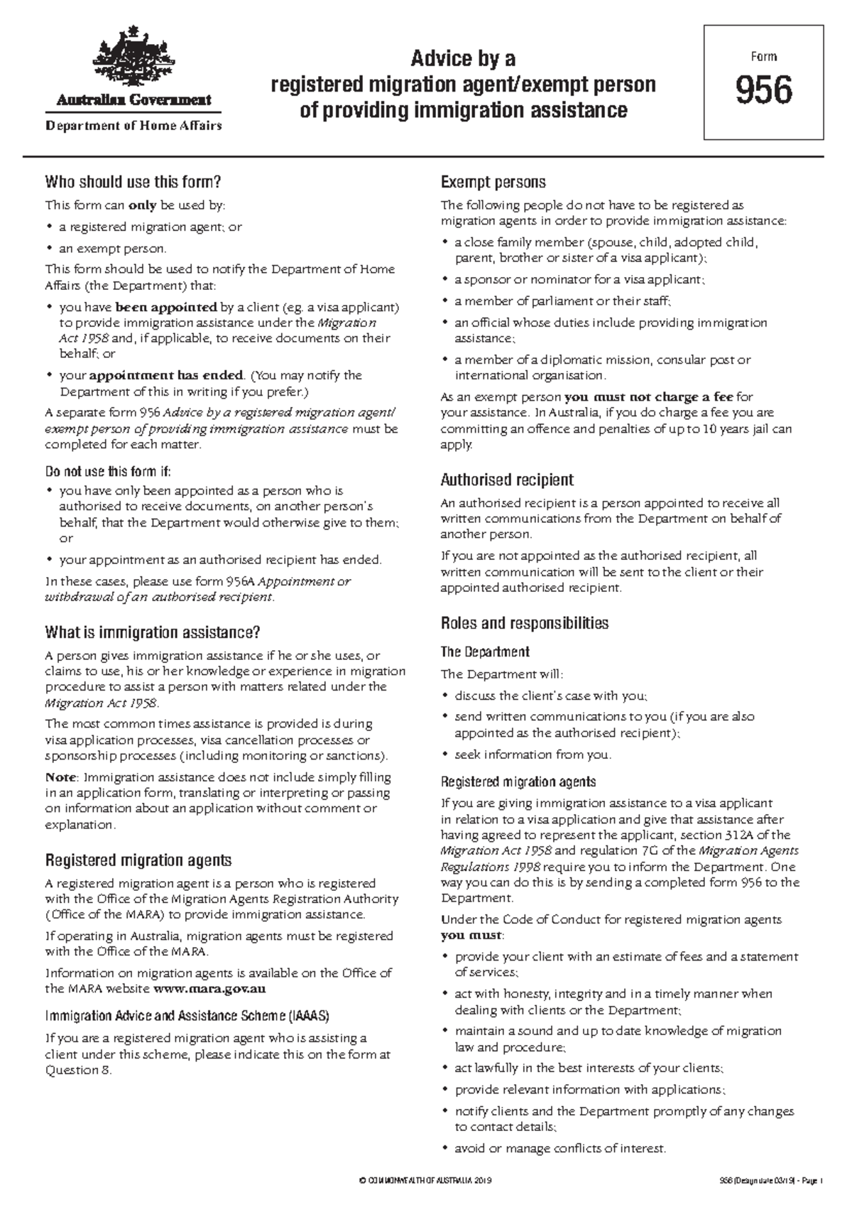 956 - form - Form - © COMMONWEALTH OF AUSTRALIA, 2019 956 (Design date ...