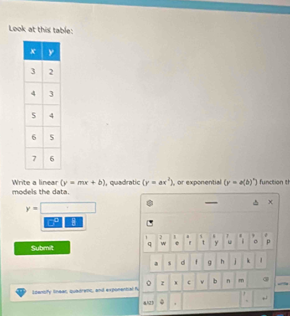 Solved: Look at this table: Write a linear (y=mx+b) , quadratic (y=ax^2 ...