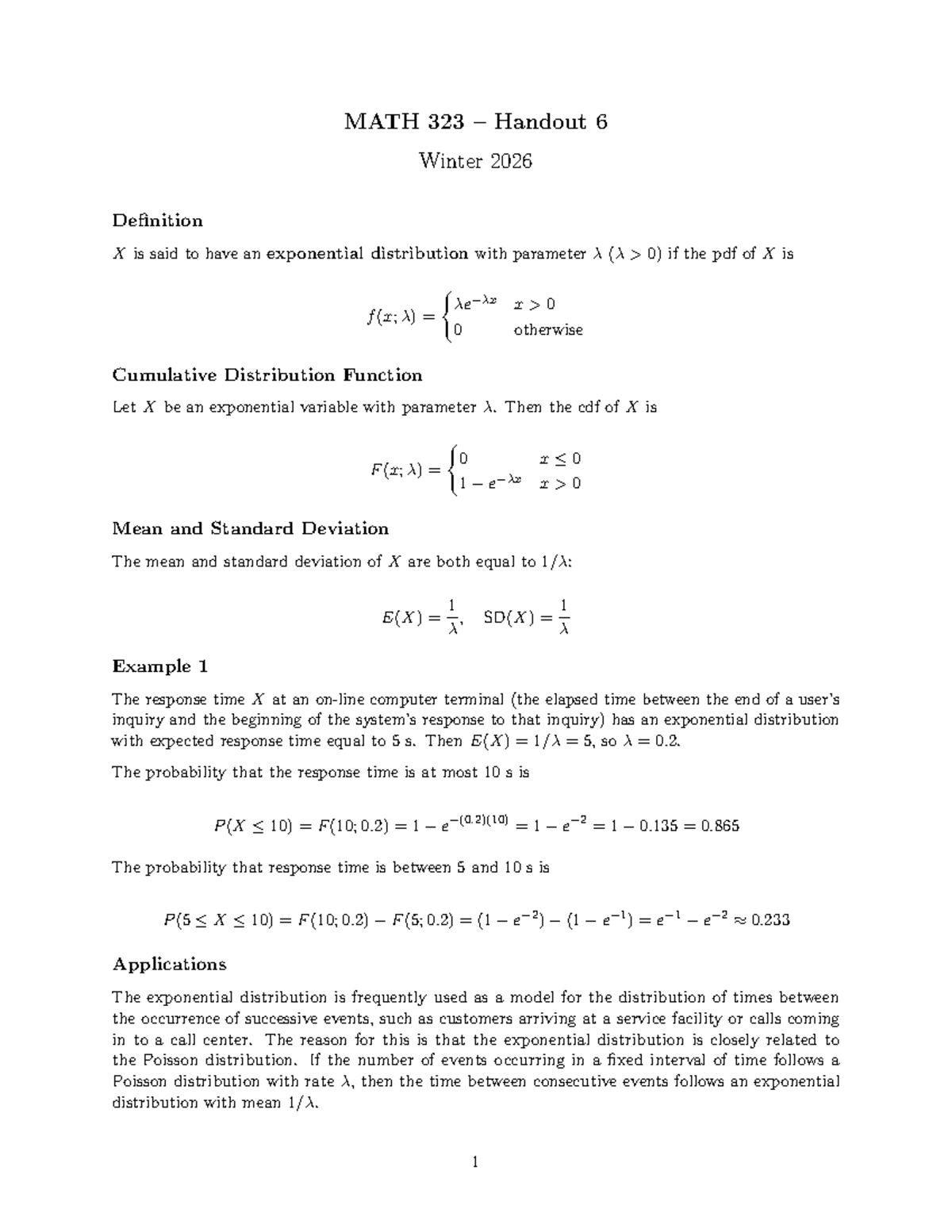 MATH 323 Handout 6: Exponential and Normal Distributions Overview - Studocu