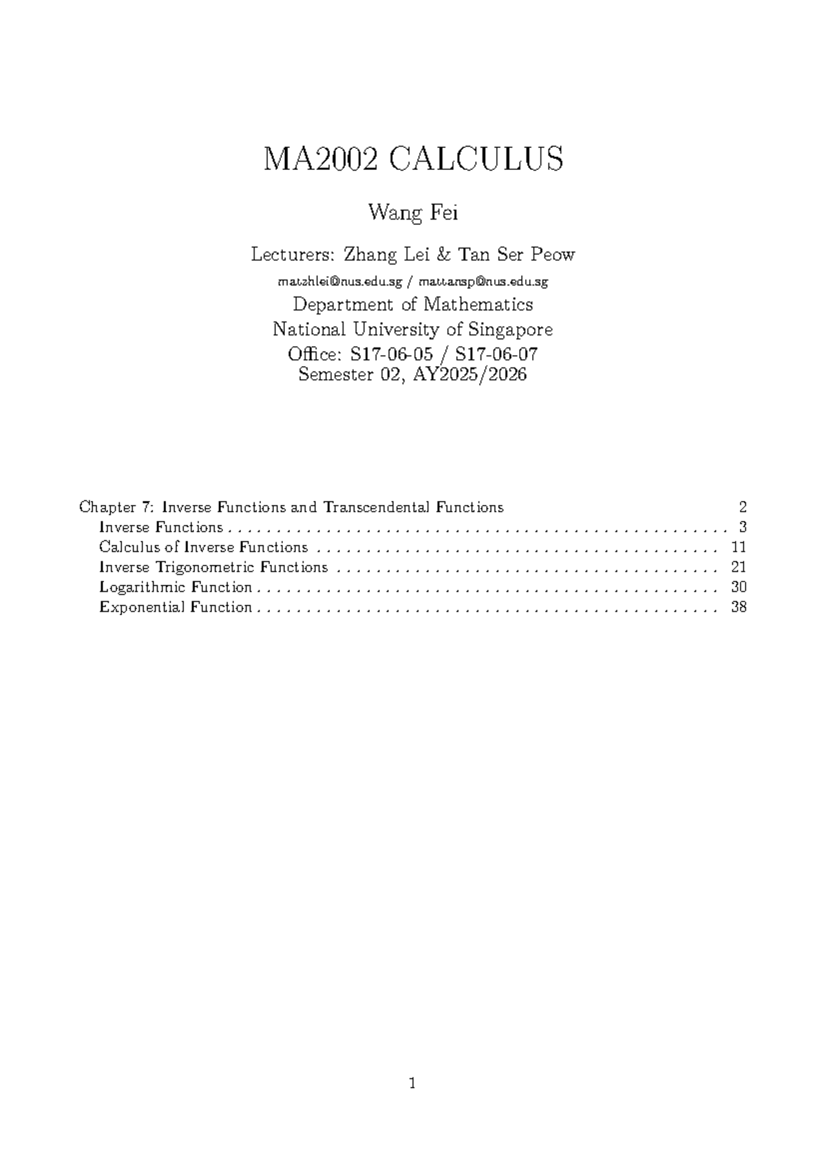 MA2002 Calculus: Chapter 7 - Inverse & Transcendental Functions Notes ...