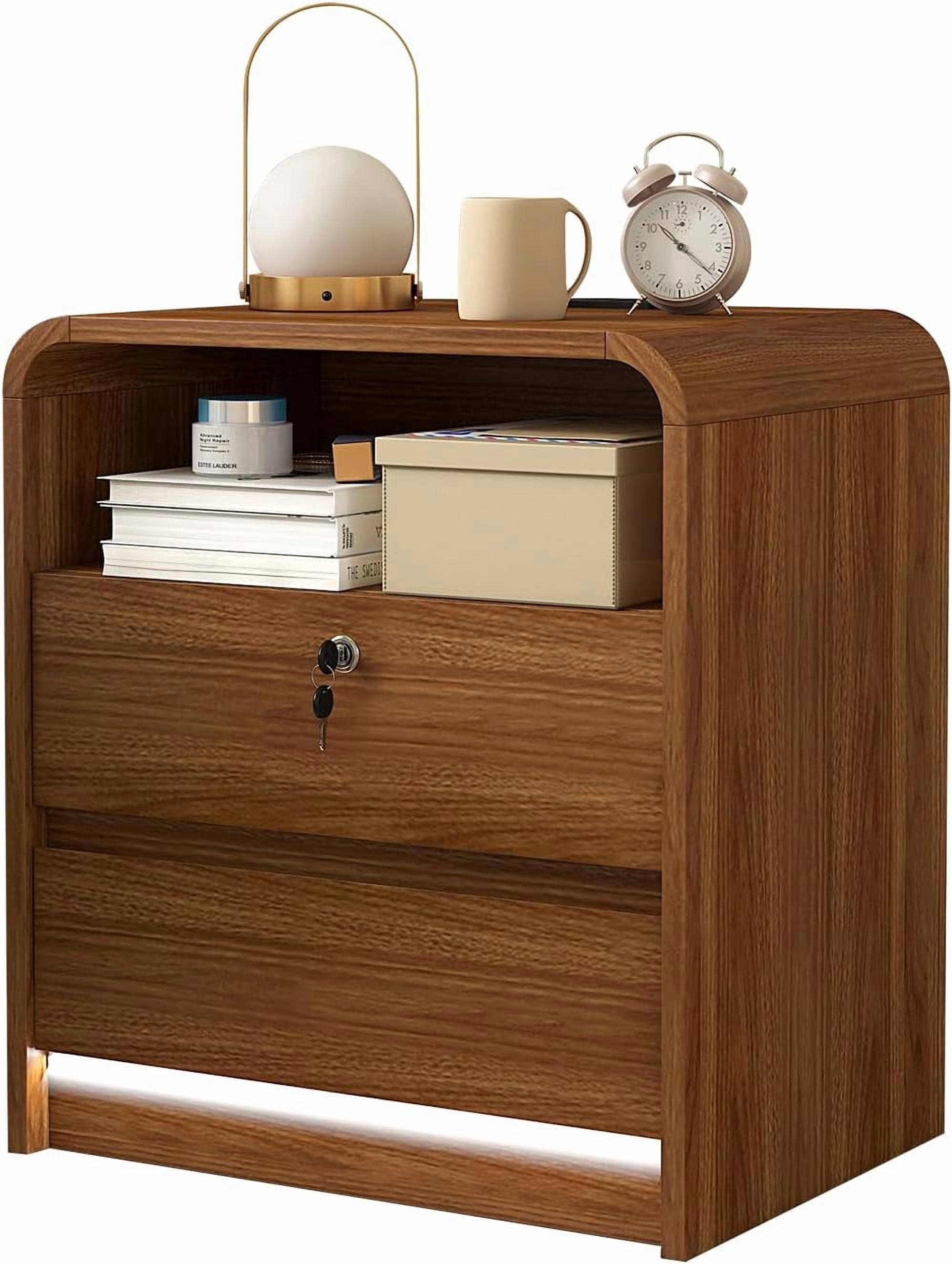 23.6" Walnut Nightstand Charging Station, Motion-Activated LED Light ...
