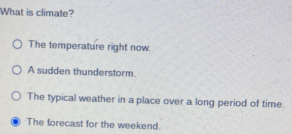 Solved: What is climate? The temperature right now. A sudden ...