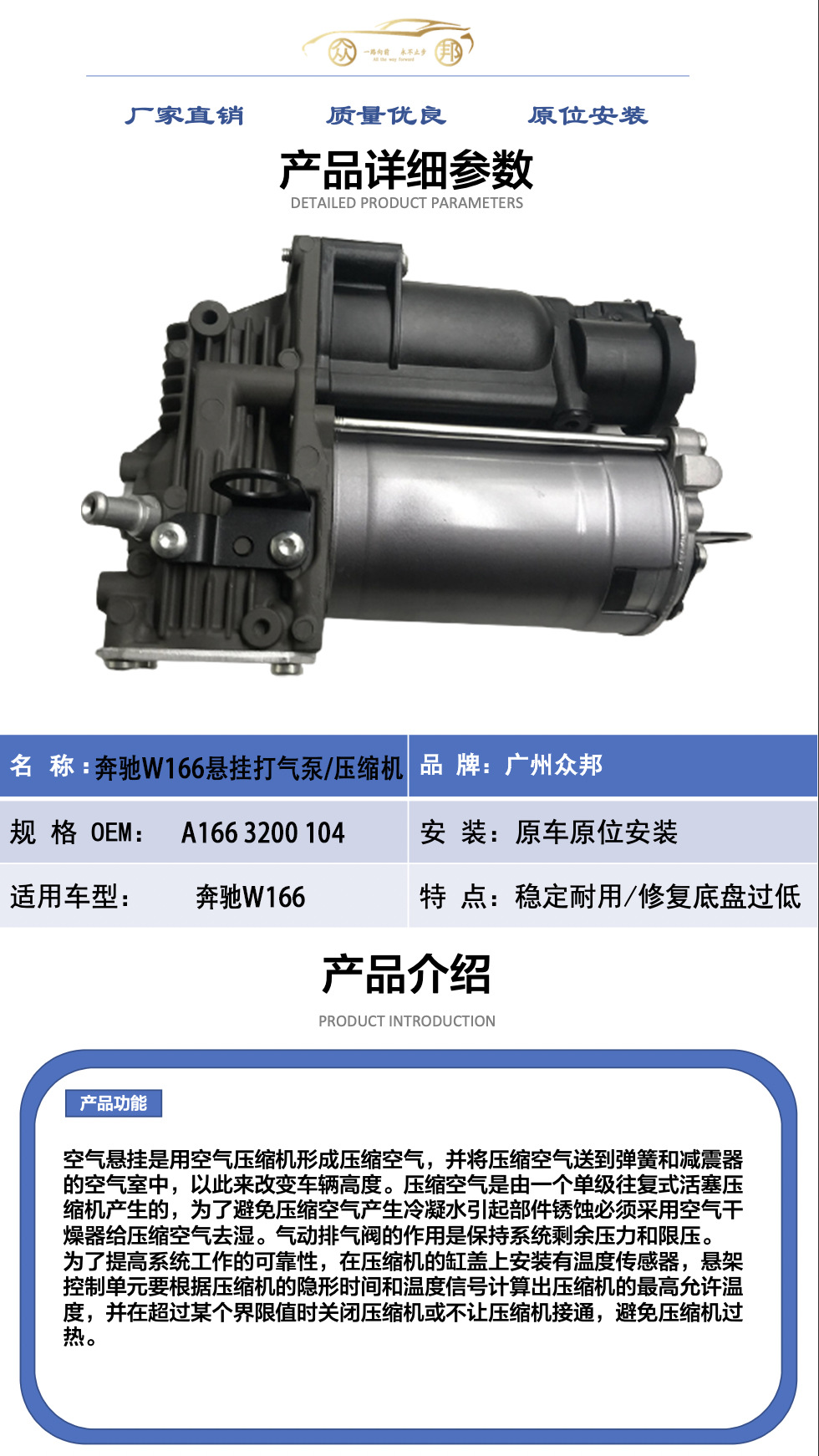 【众邦】适用于奔驰W166空气减震悬挂打气泵A1663200104-阿里巴巴