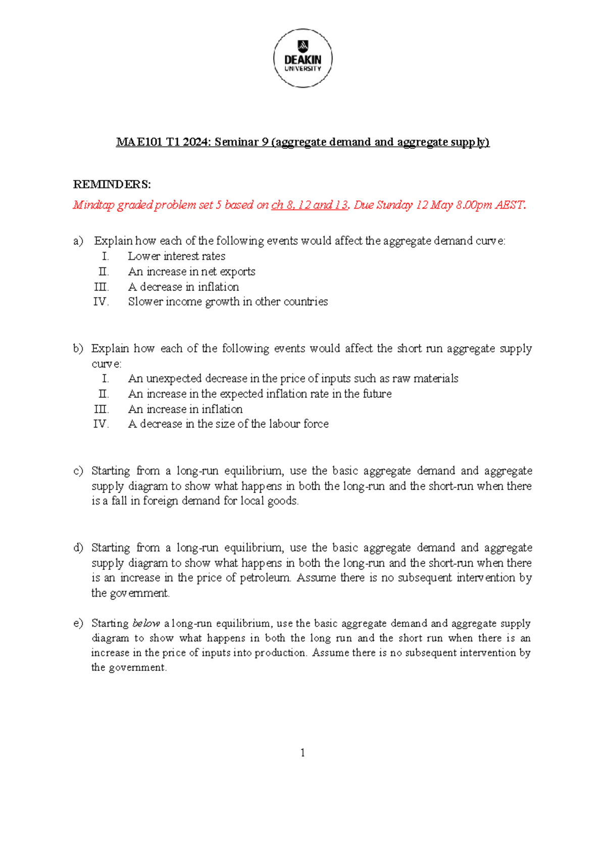 9 2024 - abc - MAE101 T1 2024: Seminar 9 (aggregate demand and ...