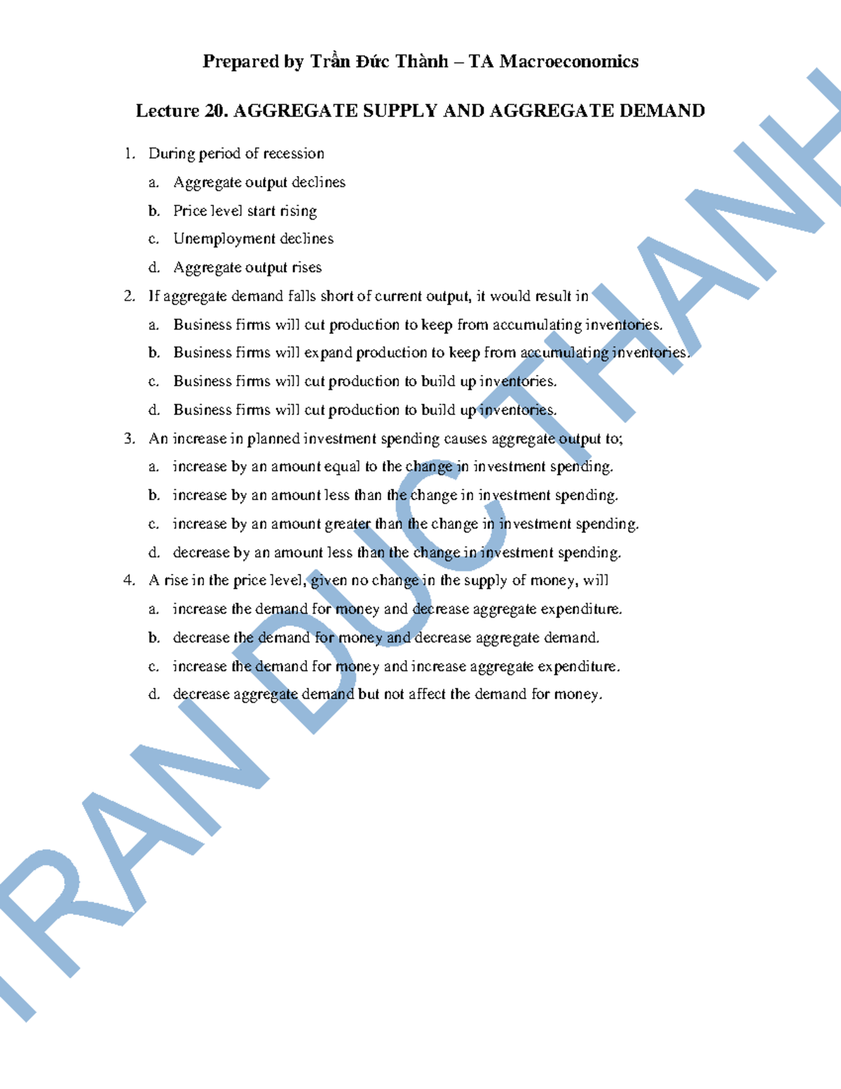 MCQ Chap 20 No A - abc - Lecture 20. AGGREGATE SUPPLY AND AGGREGATE ...