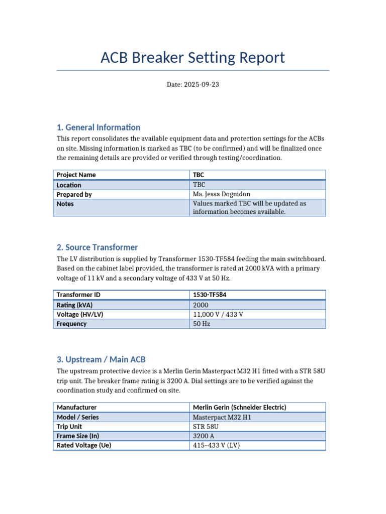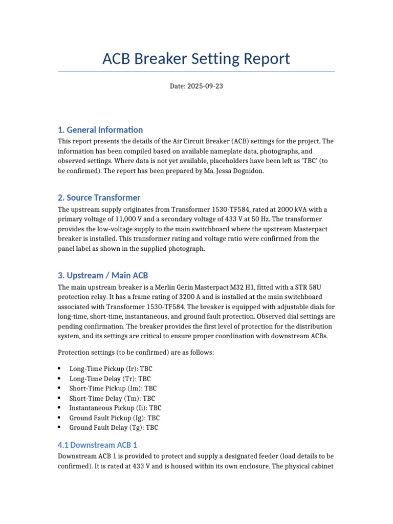 ACB Breaker Setting Report Paragraph | PDF | Transformer | Power ...