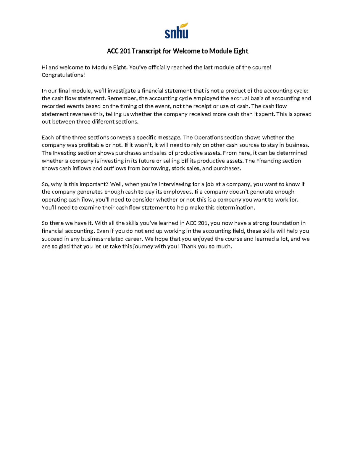 ACC 201 Transcript for Welcome to Module Eight - You’ve officially ...