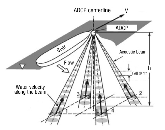 Illustration of a boat-mounted acoustic Doppler current profiler (ADCP ...