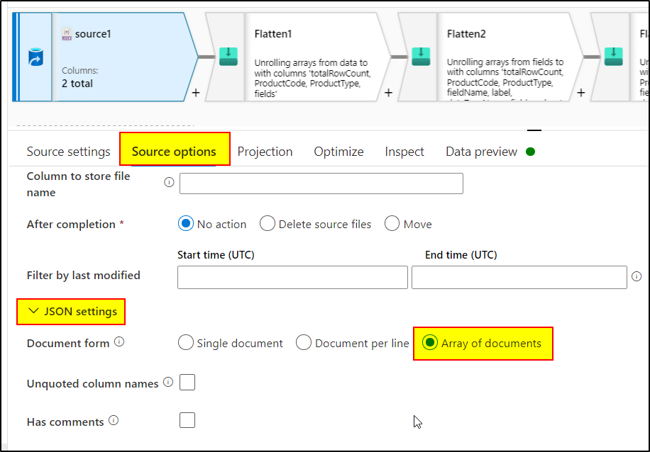 How to parse nested json array of document in ADF data flow - Microsoft Q&A