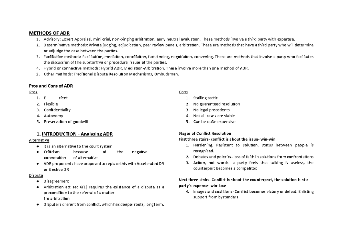 ADR Methods and Processes: Comprehensive Overview for LAW 101 - Studocu