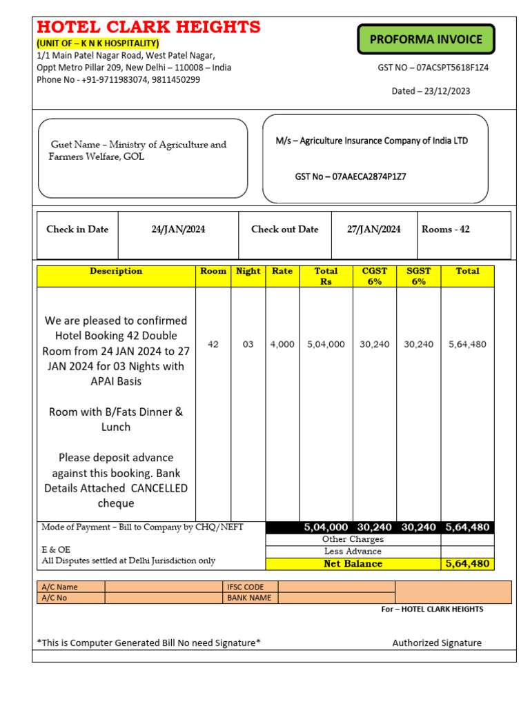 Proforma Invoice - Clark Heights - Aic of India 24-27 Jan 2024 | PDF