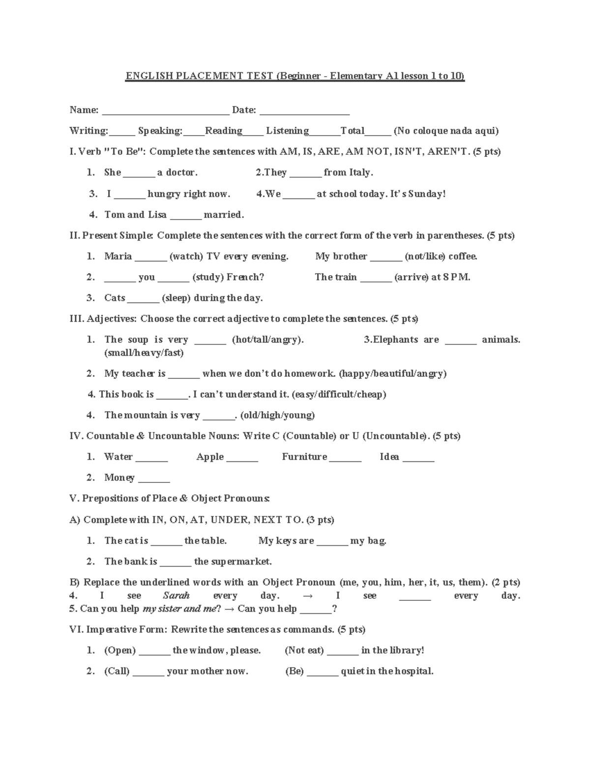 ENGLISH PLACEMENT TEST A1: Lessons 1-10 Complete Guide - Studocu