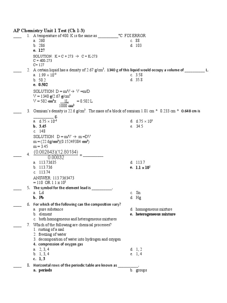 AP UNIT 1 Practice Test - AP Chemistry Practice Problems Units 1/ Name ...
