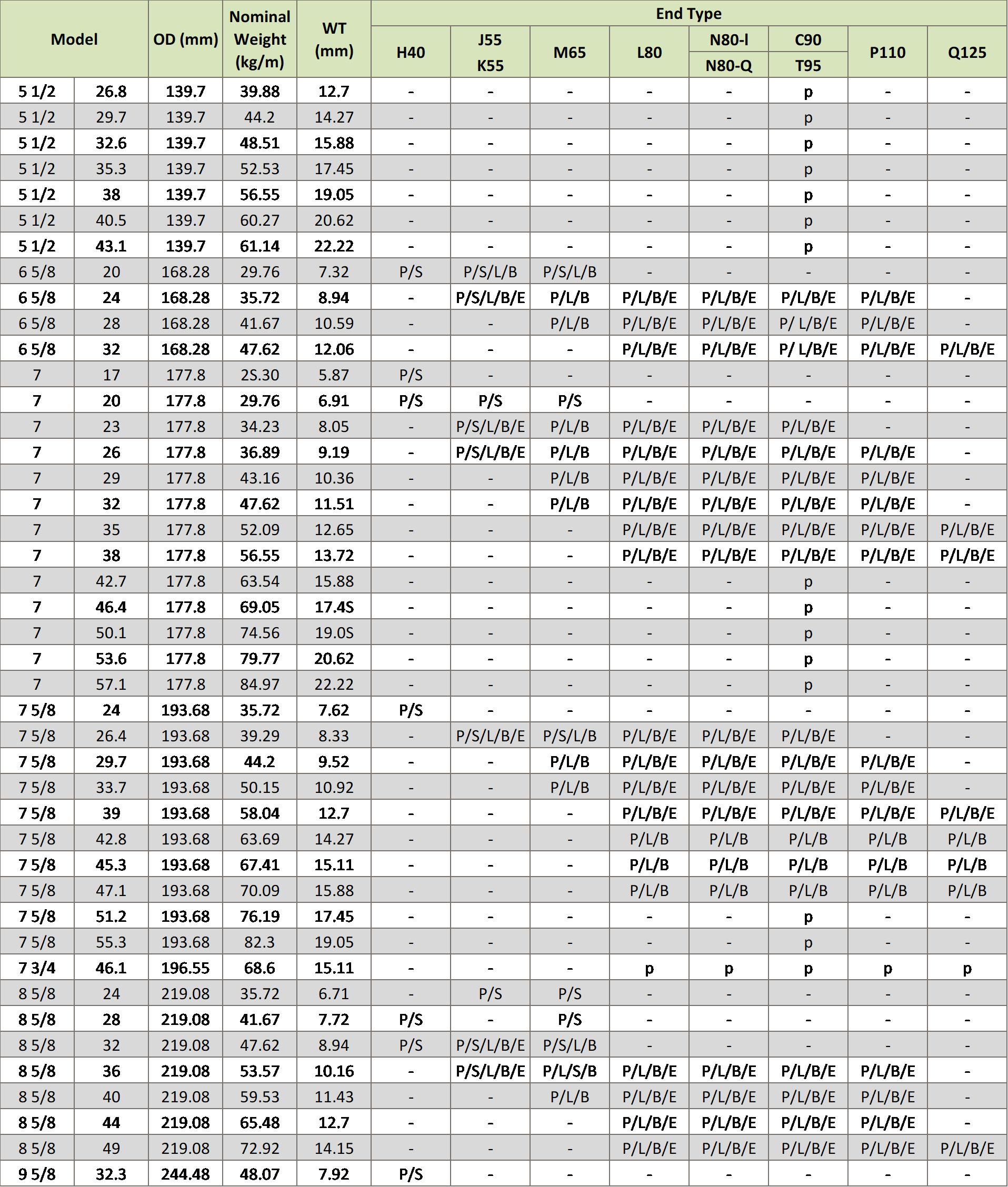 API 5CT Casing And Tubing Size Chart