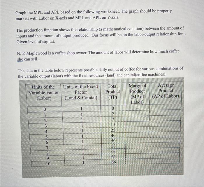 Solved Complete the following table and graph MPL, APL, and | Chegg.com