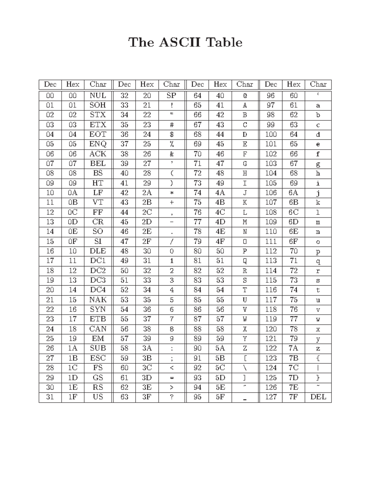 Ascii Table - The ASCII Table Dec Hex Char Dec Hex Char Dec Hex Char ...