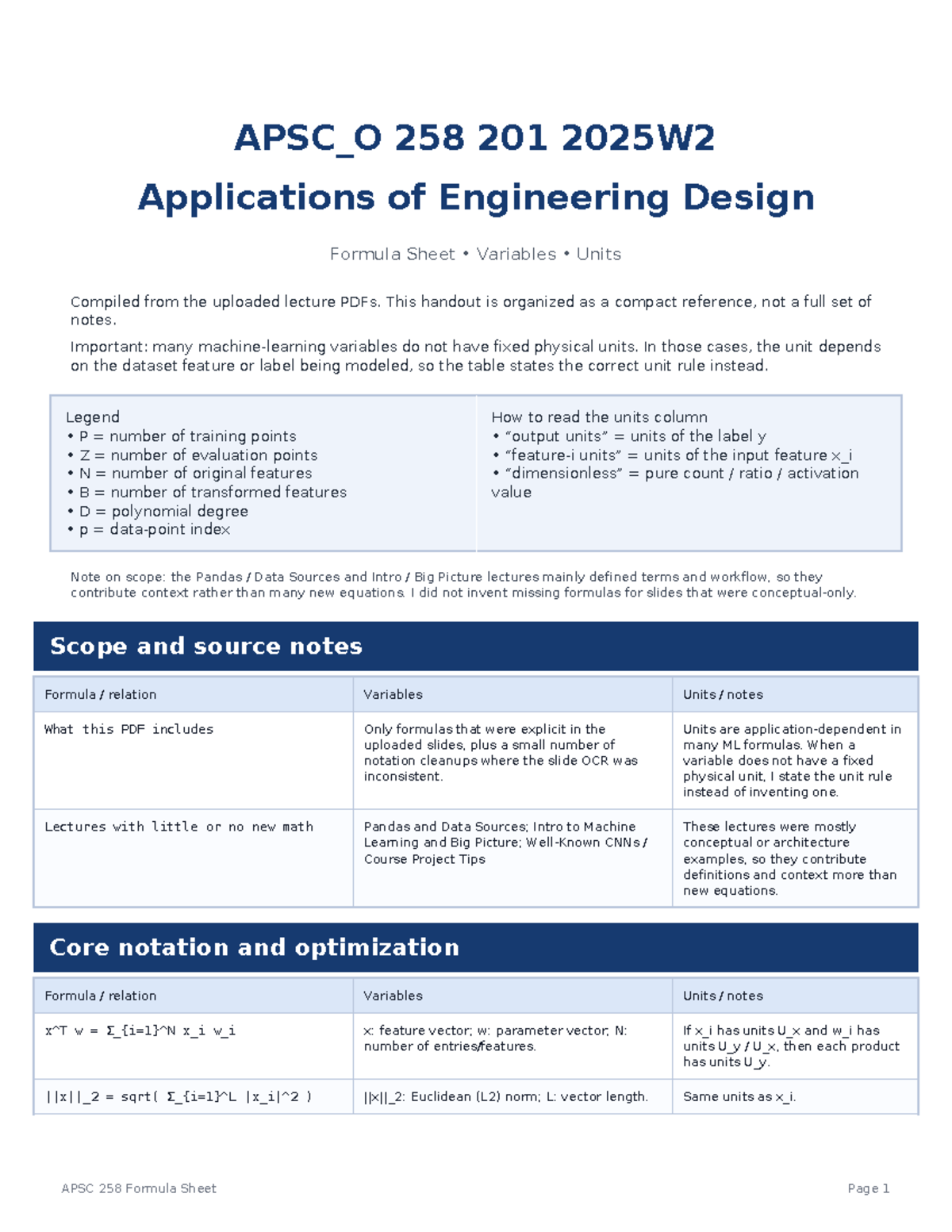 APSC 258 2025W2 Engineering Design Formula Sheet & Variable Units - Studocu