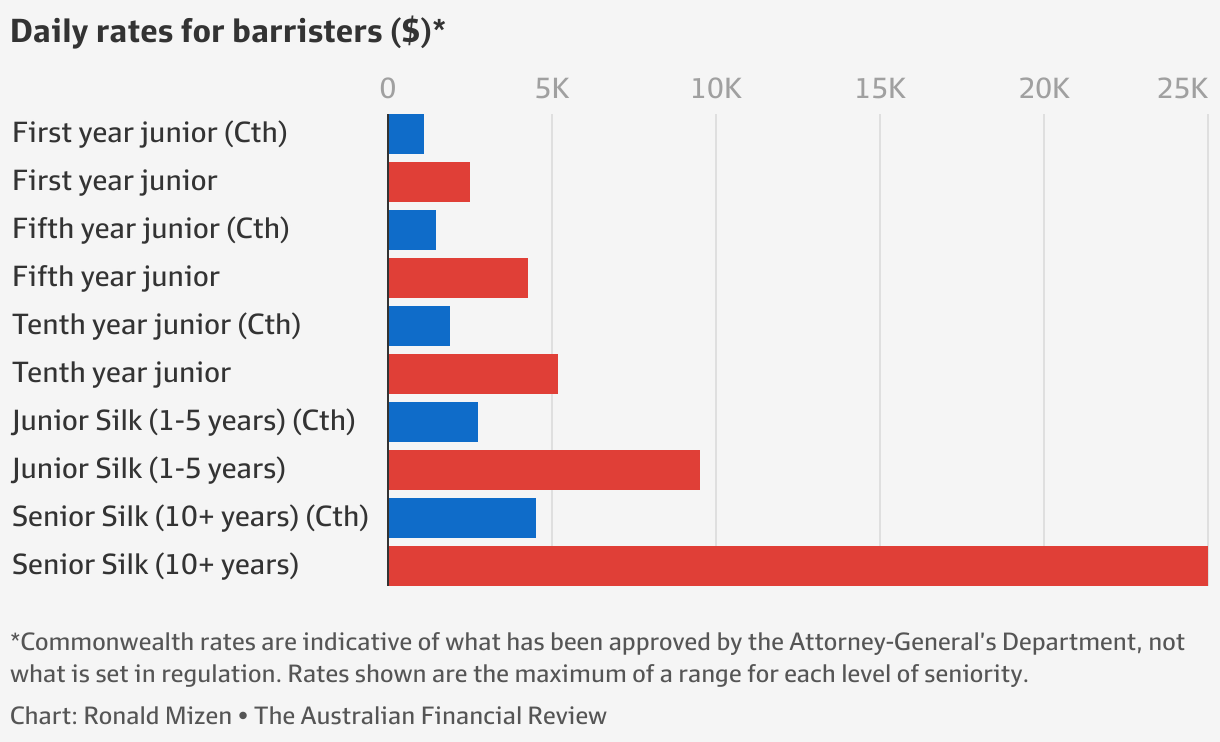 Senior barristers command up to $25k a day, but ASIC, ACCC pay under $5k