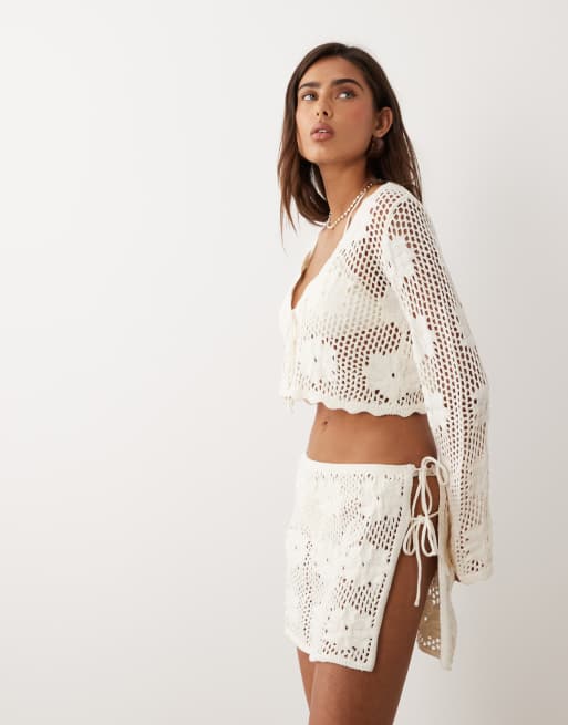 The Frolic exclusive crochet tie front long sleeve beach crop top and ...