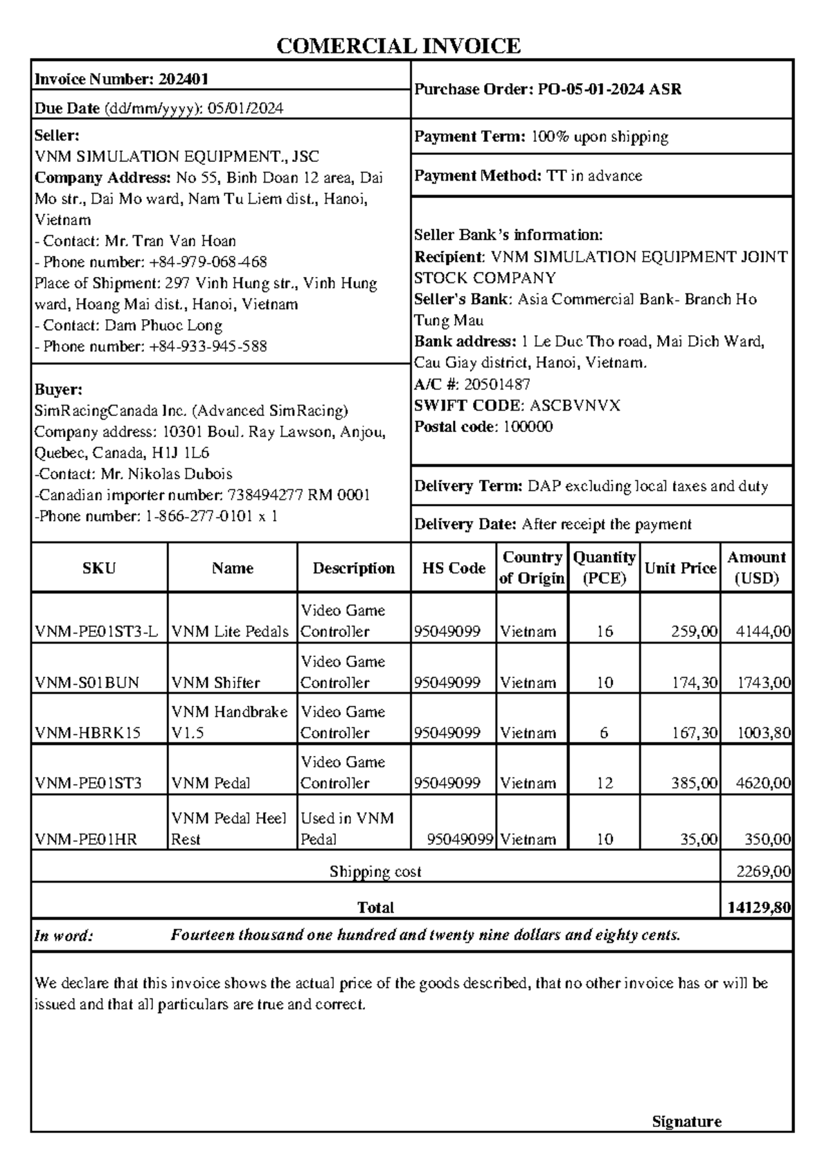 Comercial Invoice ASR 05 - VNM Simulation Equipments Details - Studocu