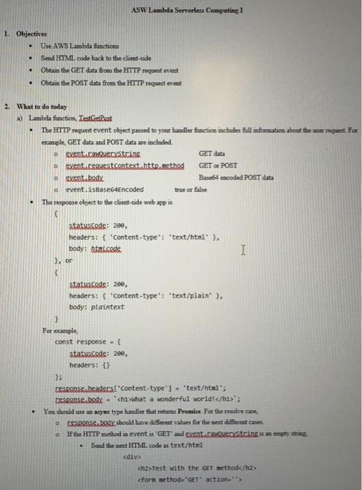 ASW Lambda Serverleas Computing I 1. Objectives - Use | Chegg.com