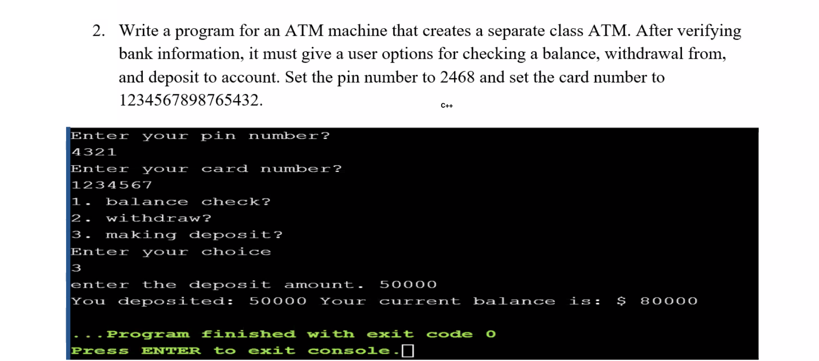 Solved 2. Write a program for an ATM machine that creates a | Chegg.com