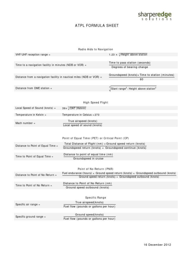 ATPL Formula Sheet 16 DEC 2012 | PDF | Airspeed | Transport