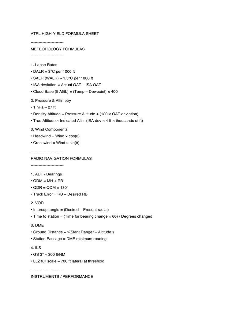 ATPL High Yield Formula Sheet | PDF