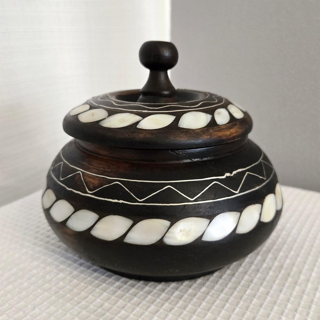 Vintage Turkish Abalone Shell Embedded Wood Storage Bowl Container W ...