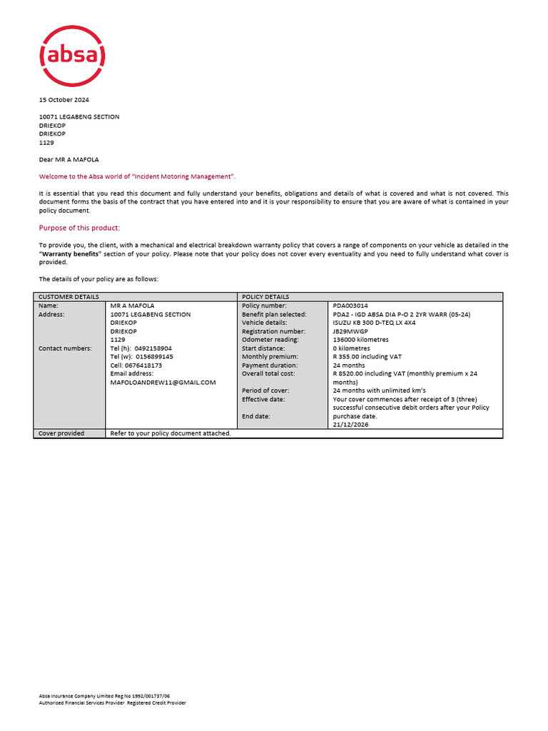 Absa Pre-Owned Warranty Policy Guide | PDF | Insurance | Clutch