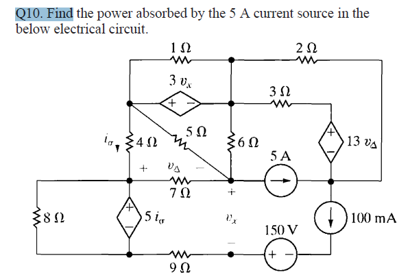 Q10. Find the power absorbed by the 5 A current | Chegg.com